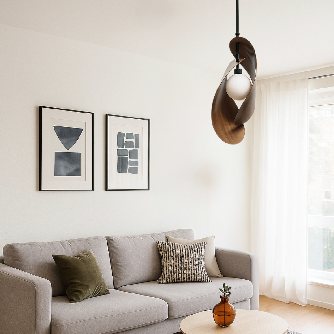 Elevate your space with the graceful and modern design of the Waltz Hanging Lamp. This exquisite lamp features a smooth, fluid twist that exudes sophistication. The sleek, polished metal seamlessly wraps around a soft, glowing glass globe, creating a striking balance between elegance and simplicity. Perfect for contemporary living rooms, dining areas, or office spaces, may be hung individually or as a cluster.